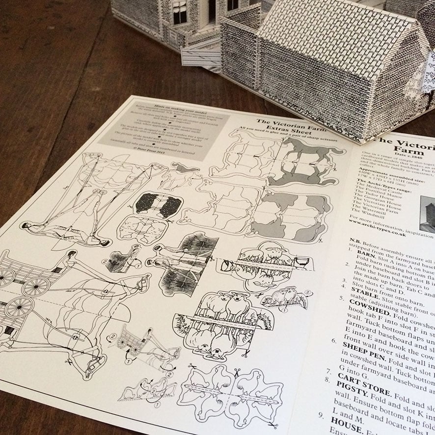 An architectural cardboard model to get your creative juices flowing. Drive tractors around your own Victorian farm with a simple pre-cut slot together construction. It comes in a hand screen printed box with instructions and extra elements including farmer with plough, horse and cart, cows, sheep, pigs and chickens.