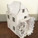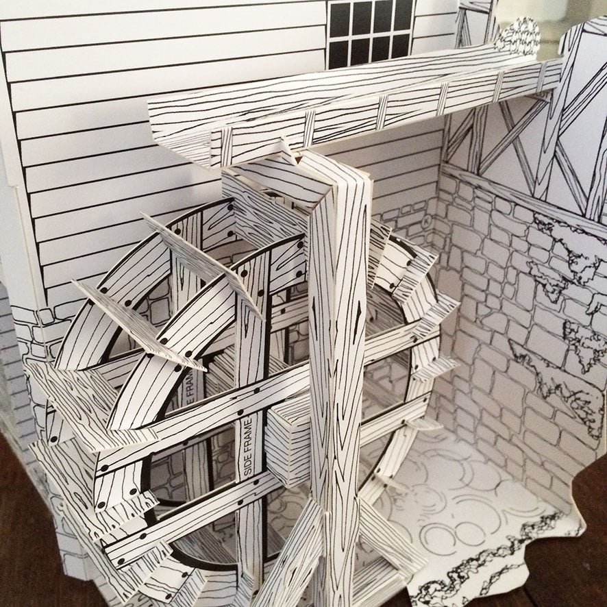An architectural cardboard model to get your creative juices flowing. Become the owner of a watermill with a simple pre-cut slot together construction. It comes in a hand screen printed box with instructions and extra elements including mill stone and hopper, chutes, grain bin and horse with delivery cart. Waterwheel turns!