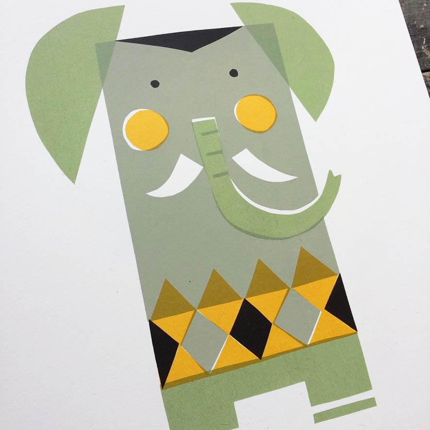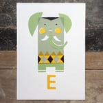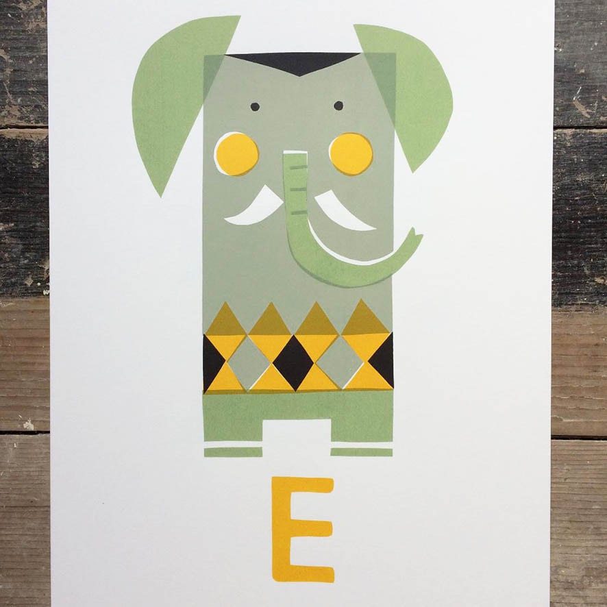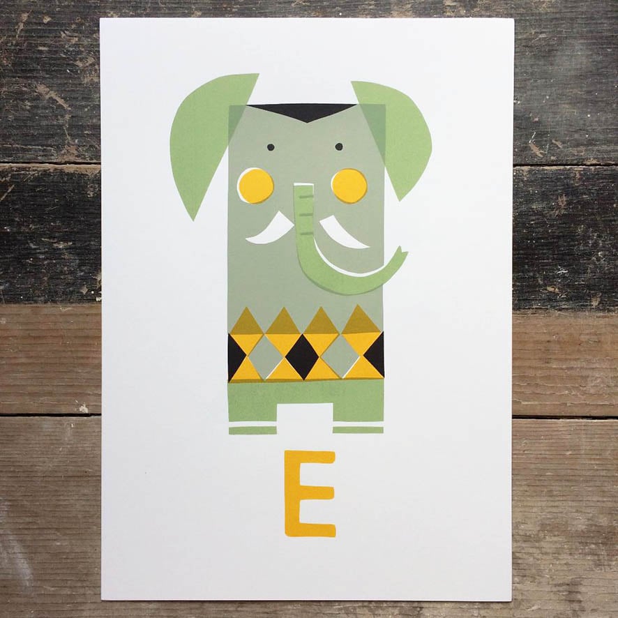 A gentle giant! A cheerful alphabet print to brighten any wall. Hand-pulled 4 colour screen print using water based inks on lovely thick paper. This is an open edition print.