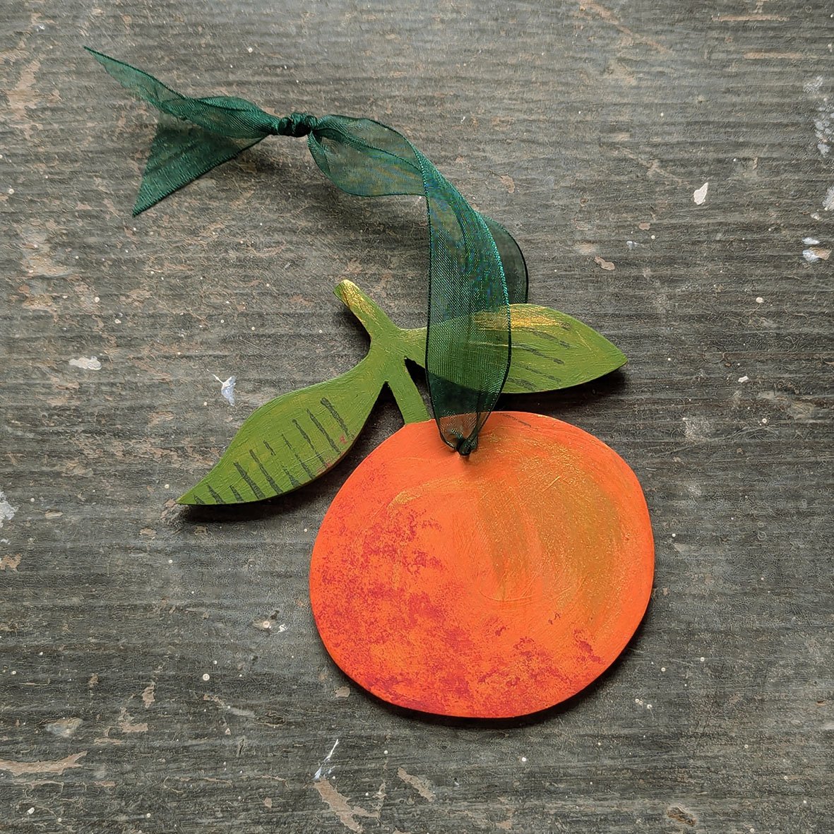 A juicy orange to hang from a suitable branch, hook or door knob. This is a hand cut, hand painted, double-sided plywood decoration and has the ability to gracefully swing from your chosen hanging place!