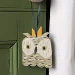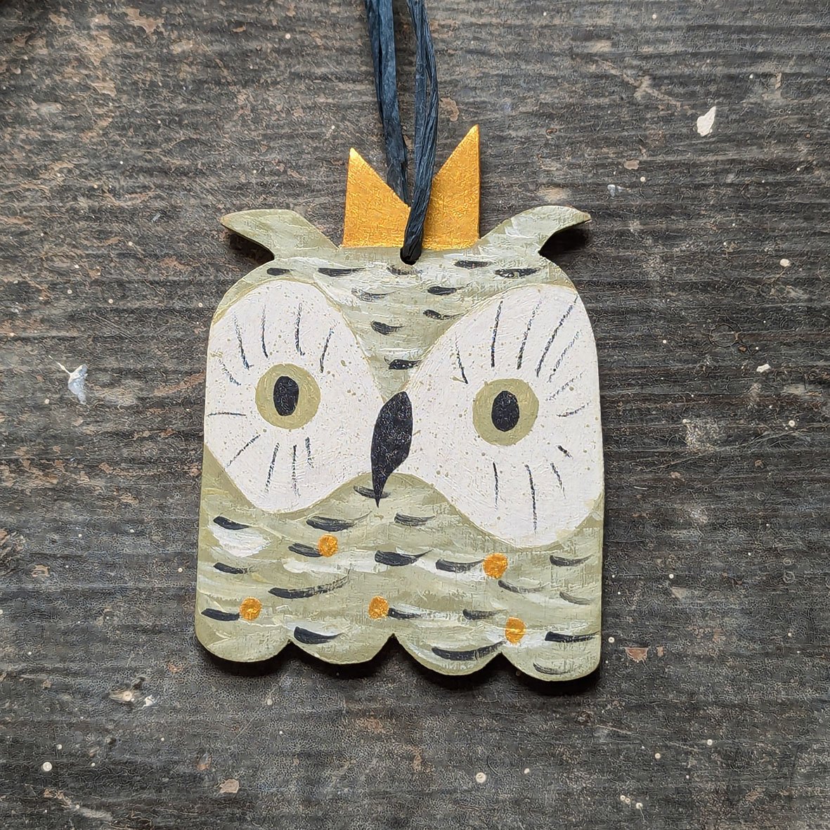 An owl to hang from a suitable branch, hook or door knob. This is a hand cut, hand painted, double-sided plywood decoration with collaged elements, and has the ability to gracefully swing from your chosen hanging place!